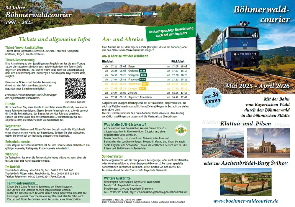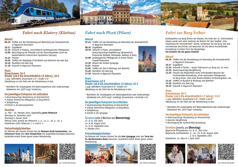 Die beliebten, grenzüberschreitenden Ausflugsfahrten mit dem Zug von Bayerisch Eisenstein durch den Nationalpark Šumava starten ab Mai 2025 wieder wöchentlich. Immer mittwochs in das geschichtsträchtige Klattau, in den bayerischen Schulferien immer dienstags zur romantischen Burg Švihov und von Juli bis Oktober alle zwei Wochen jeden Donnerstag ins idyllische Pilsen.